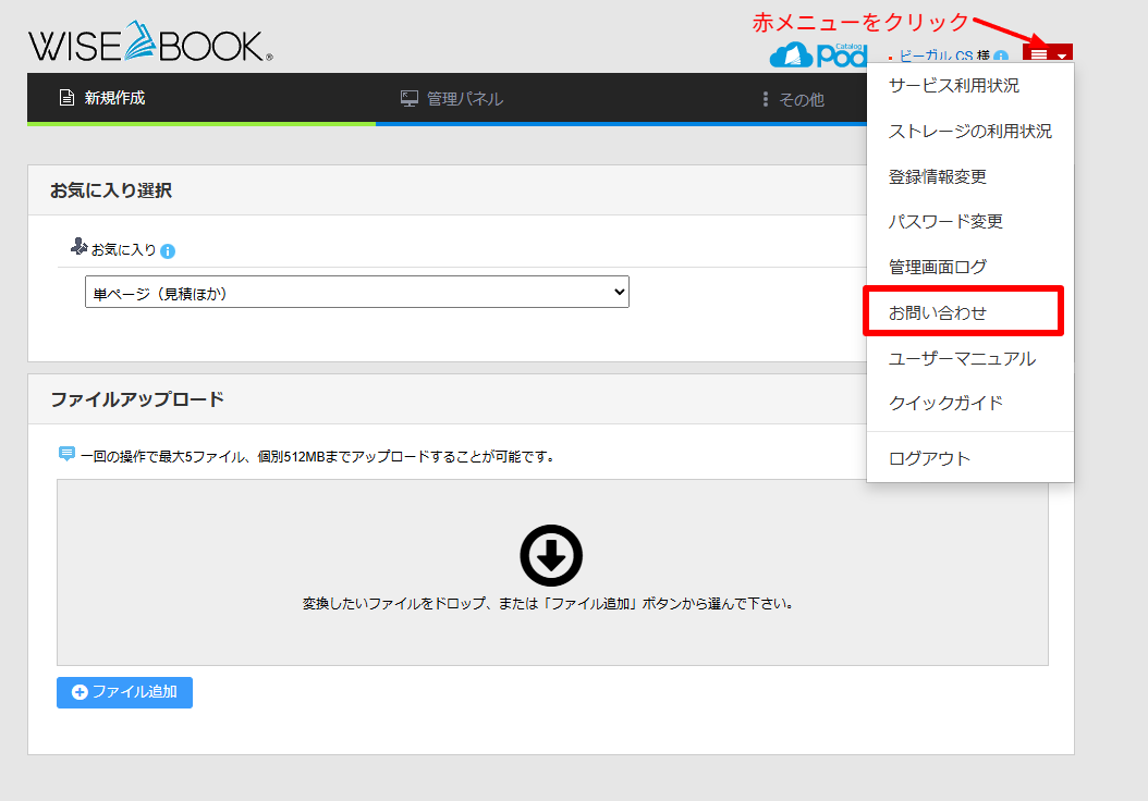 管理画面ログイン後、赤メニューをクリックし、「お問い合わせ」メニューよりお問い合わせください。