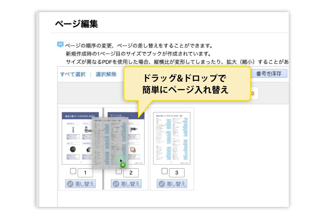 ドラッグ&ドロップで簡単にページの入れ替えができます。見開き調整などにも最適。