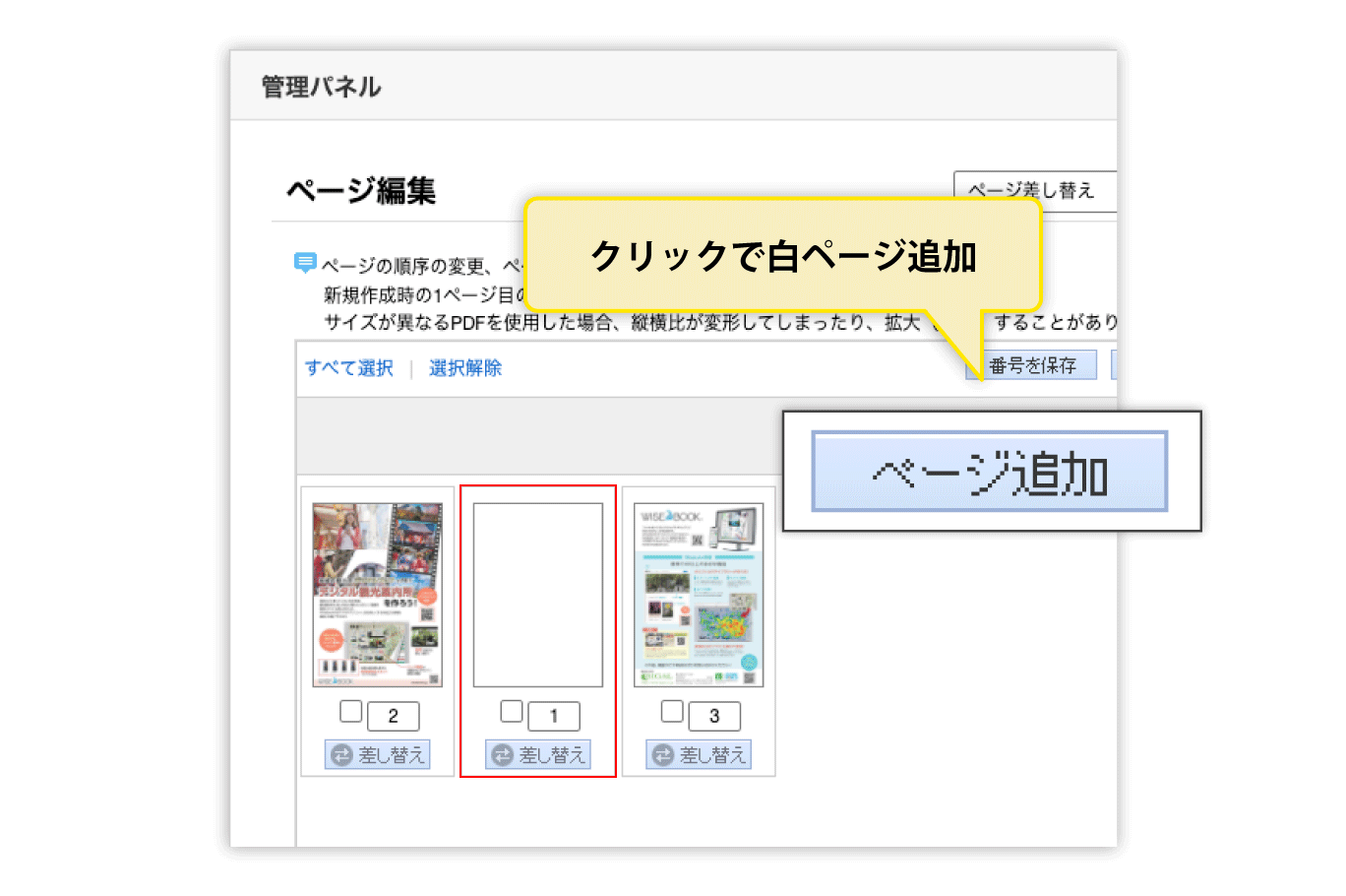 ページ数の違うPDFを差し替える際、あらかじめ追加になったページ分の白ページを追加することでスムーズな差し替えが可能です。あとから見開きに合わせて白ページを差し込むのにも便利です。