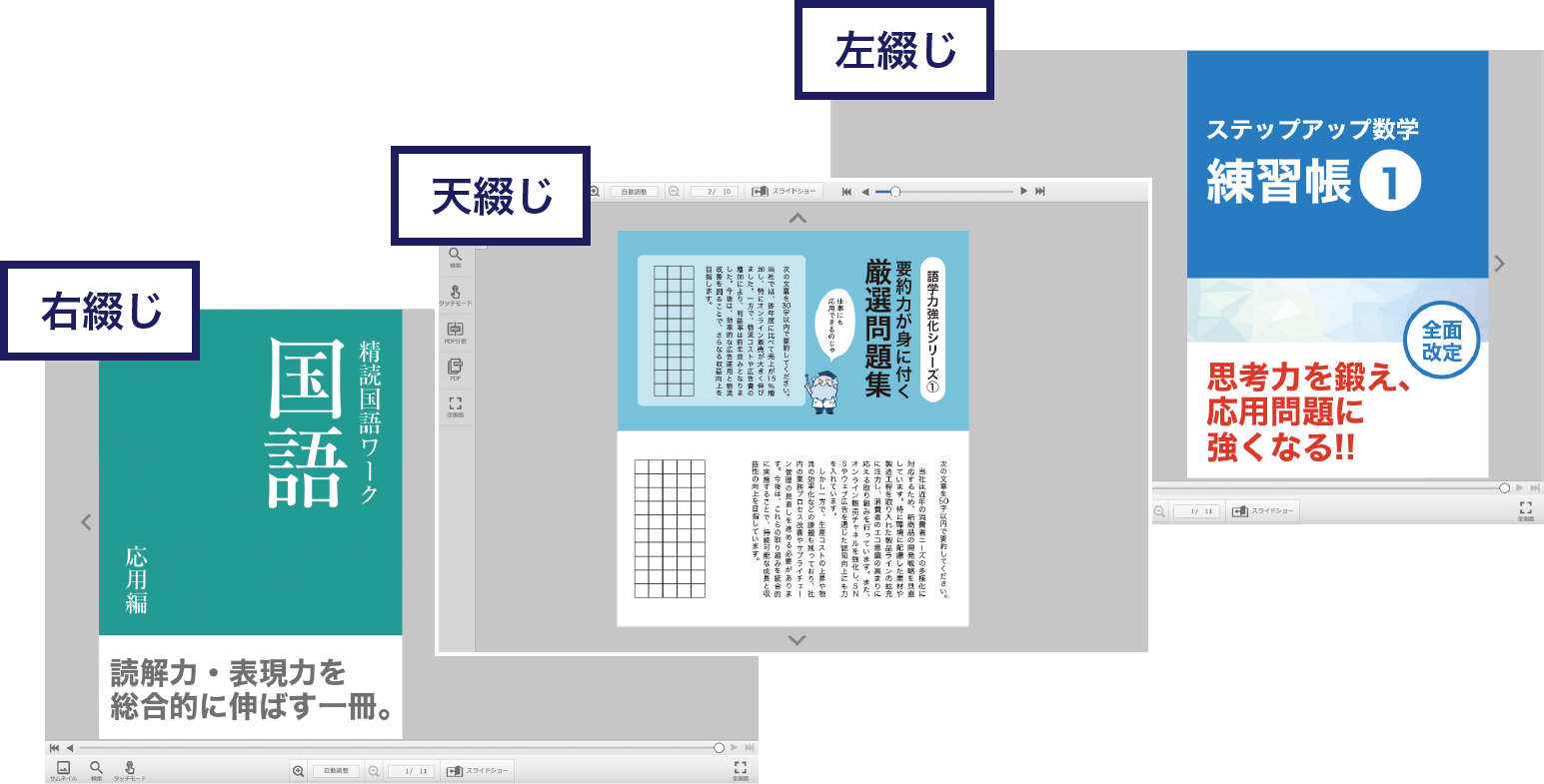 ベーシックな右綴じ、左綴じの他に天綴じビューアも選択が可能。綴じ方向の指定は管理画面から簡単に変更でき、利用に応じた最適な表示形式を設定できます。